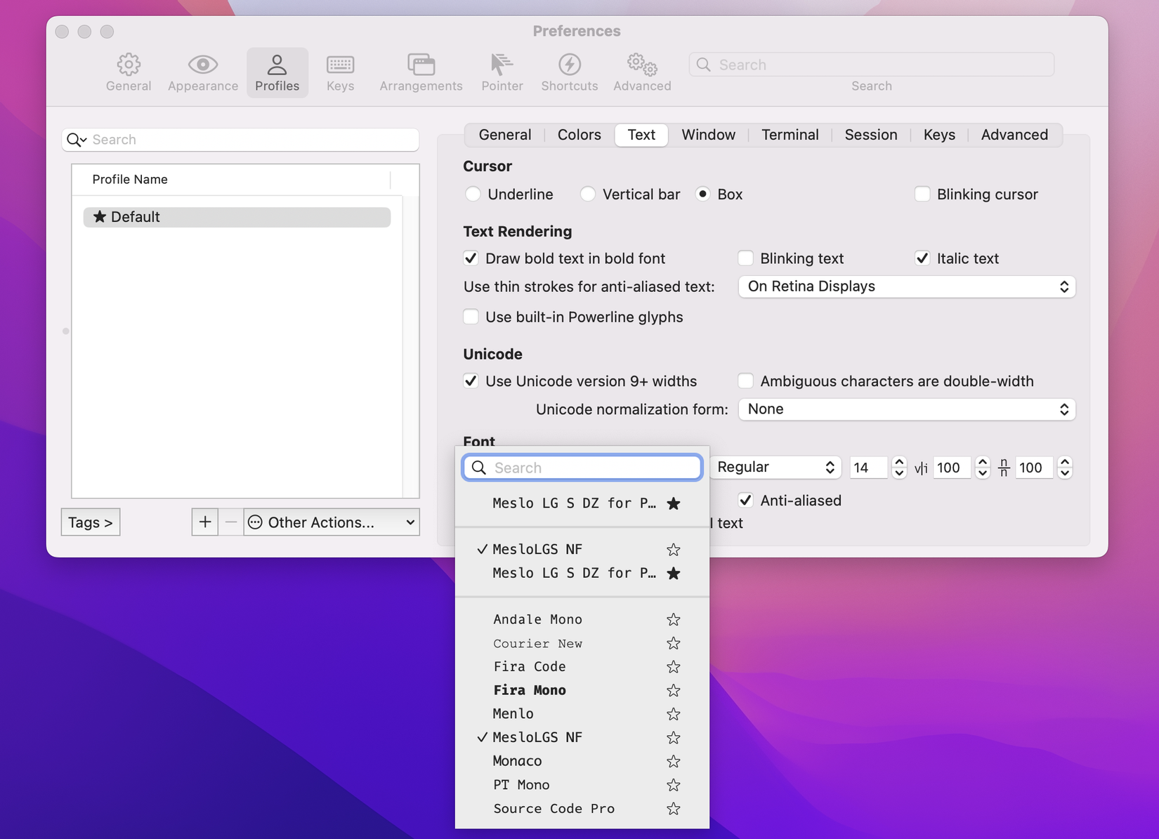 Và chọn font là MesloLGS NF đã được cài trước đó