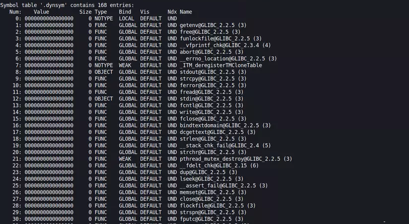 Sử dụng readelf với -s flag để tìm kiếm các function --wide để hiển thị symbols name đầy đủ
