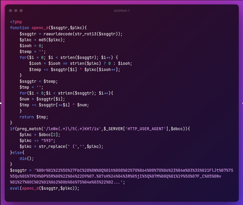 Bọn chúng rất khôn ngoan, nếu như chúng ta chỉ là người bình thường truy cập thì file không hiển thị gì, nhưng anh sẽ thấy chúng check User-Agent của người dùng và dùng nó làm key để giải mã đoạn code bên trong. Bất ngờ chưa?
