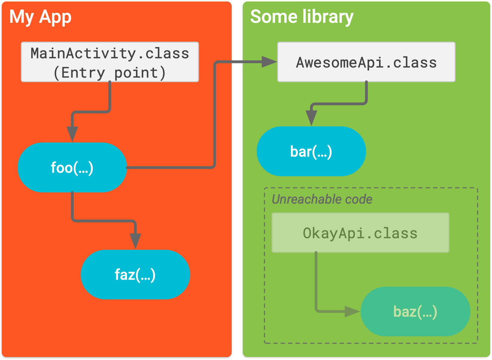 Như hình bên dưới chúng ta có một app với runtime library dependency. Trong khi kiểm tra code của app, R8 xác định rằng các method foo(), faz(), và bar() có thể truy cập từ entry point MainActivity.class. Tuy nhiên, class OkayApi.class hoặc phương thức baz()của nó không bao giờ được sử dụng bởi app tại runtime, và R8 sẽ remove code này khi shrinking app.
