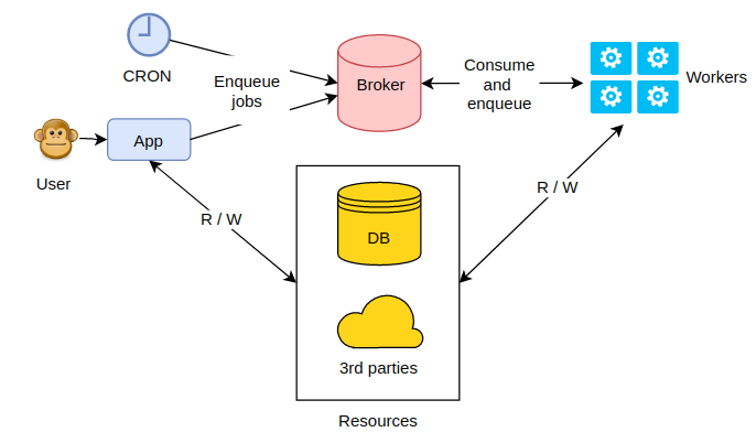 Đây là mô hình đơn giản, server xử lý nhanh chóng và phản hồi ngay lập tức kết quả cho người dùng. Tuy nhiên có những tác vụ, request server không xử lý ngay lập tức được, cần thời gian thực thi lâu hơn bình thường, người dùng phải chờ một khoảng thời gian trước khi server phản hồi lại. Những tác vụ như vậy gọi là synchronous task và có thể xử lý bằng background job hay asynchronous job (xử lý bất đồng bộ) trên một luồng hoàn toàn riêng biệt .