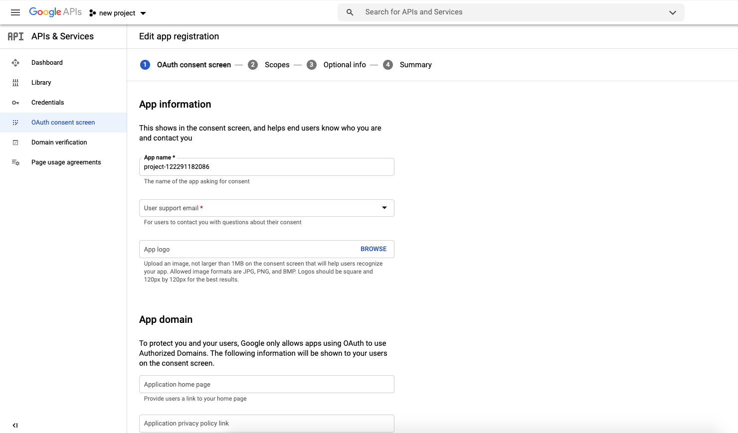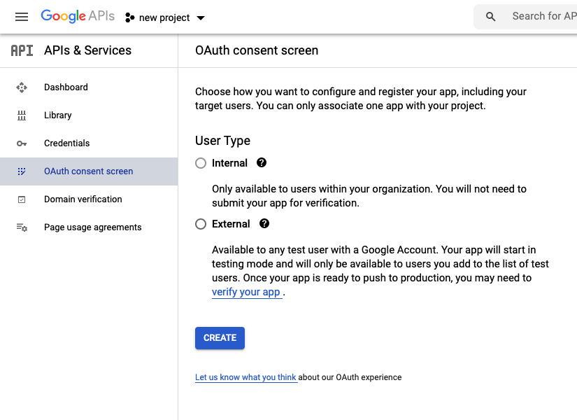Chúng ta cần phải setup OAuth cho project. Truy cập google API console và đăng nhập tài khoản develop. Tiếp đó vào tab OAuth consent screen ở khu vực bên trái màn hình. Ở đây google cho ta hai lựa chọn là internal và external, tương ứng với dùng trong workspace và ngoài workspace. Nếu bạn không đang thuộc google workspace nào thì không thể lựuac chọn internal: