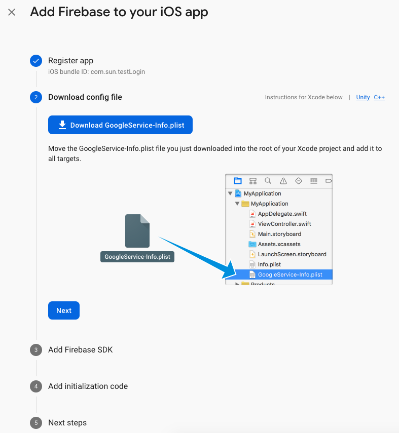 Tiếp theo ta sẽ cần download GoogleService-Info.plist file và đưa vào thư mục ios/Runner của app dưới local: