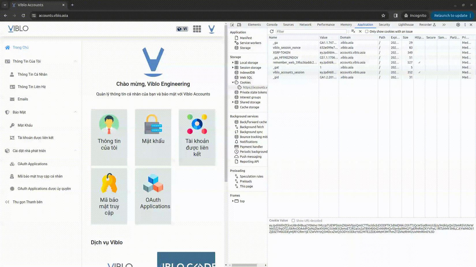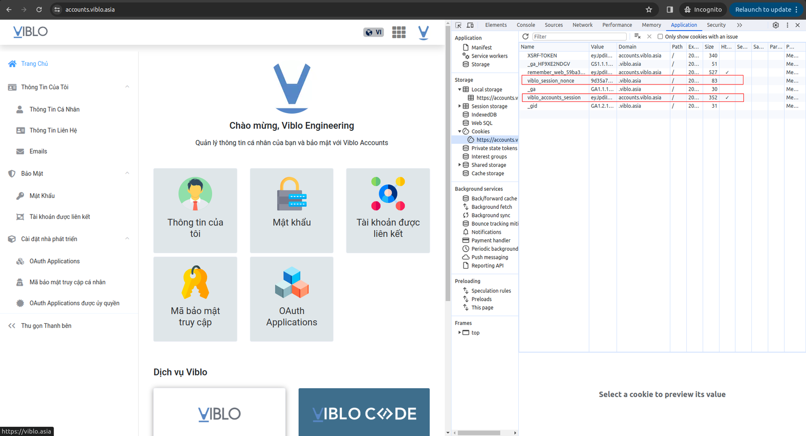 viblo_accounts_session: Cookie này là một token chứa thông tin session của Viblo Accounts, nhờ đó hệ thống Viblo Accounts sẽ đăng nhập đúng thông tin tài khoản của bạn. Cookie được lưu trữ cho domainaccounts.viblo.asiađiều này có nghĩa là tại các subdomain, dịch vụ khác của Viblo sẽ không được chia sẻ. Trường hợp cookie này hết hạn hay bị xóa nếu vẫn tồn tạiviblo_session_noncethì nó sẽ được tự động tạo lại. Cookie cũng được gắn HttpOnly bảo vệ cookie khỏi việc truy cập trái phép từ trình duyệt.