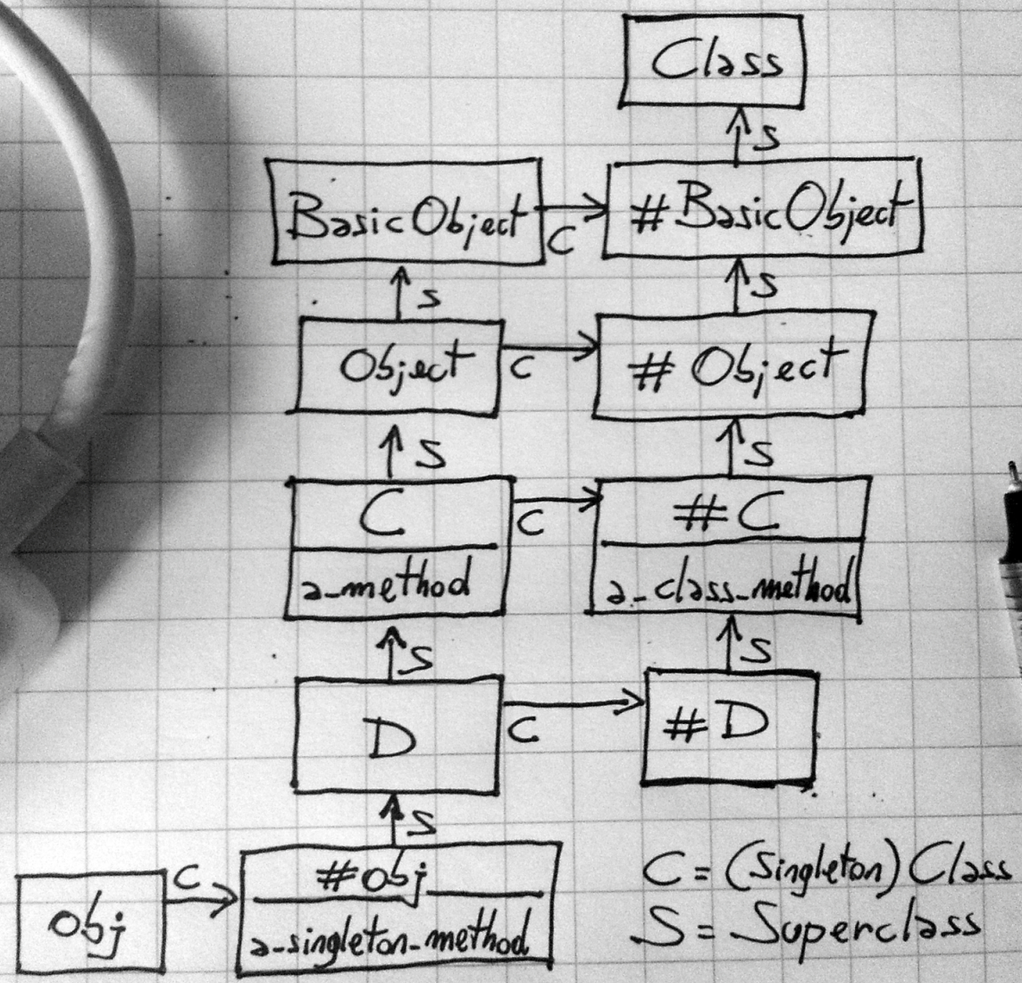 Hãy thử gọi một class method của class D trên sơ đồ trên, Ruby sẽ bắt đầu tìm kiếm class đó trong singleton class của D là #<Class:D>, nếu không có thì tiếp tục tìm kiếm đến superclass của #<Class:D> là #<Class:C>, tiến tục leo đến #<Class:BasicObject>, superclass của #<Class:BasicObject> chính là Class và superclass cuối cùng không ai khác chính là BasicObject.