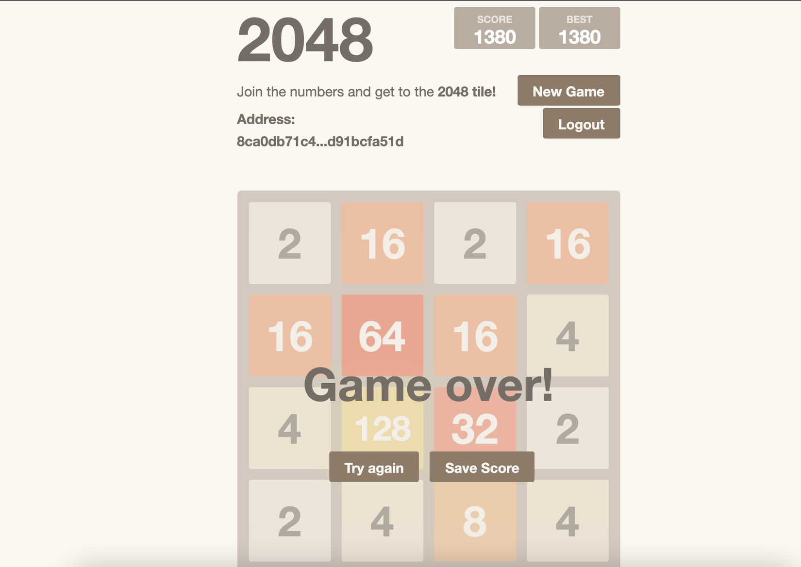 Sau khi đăng nhập và chơi, seed đã được lưu và hiển thị public key tương ứng. Khi game over, user có thể chọn save score để lưu lại số điểm của mình, khi này sẽ gọi đến hàm setScore