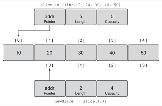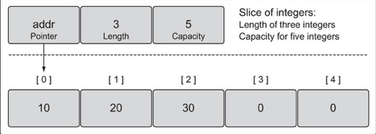 Slices là một cấu trúc dữ liệu đã được trừu tượng hoá, và thao tác với một mảng bên dưới. Nó có ba field chứa metadata giúp Go có thể quản lí được một mảng bên dưới (Hình minh hoạ bên dưới). Ba field này là con trỏ trỏ đến mảng, độ dài (length), và sức chứa (capacity) sẵn sàng của slices. Độ dài và sức chưa sẽ có một vài sự khác biệt mình sẽ đề cập ở phần sau.