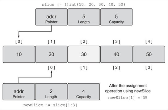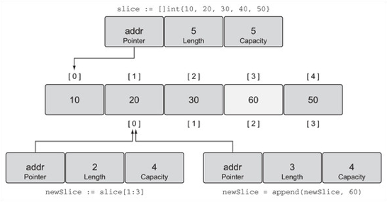 Vì newSlice vẫn còn dư (nghĩa là độ dài của slice bé hơn capacity) capacity, nên khi append hoạt động, nó hợp nhất những phần tử có sẵn và độ dài của slice và gán giá trị. Vì slice ban đầu đang chia sẻ chung mảng bên dưới, nên cũng sẽ nhìn thấy sự thay đổi ở phần tử có index là 3.