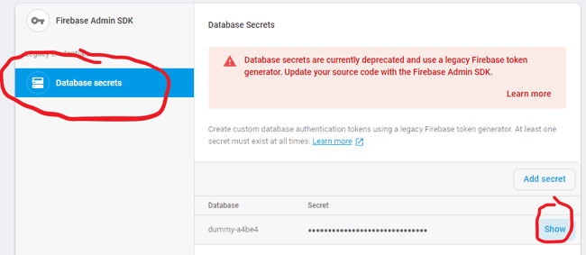 2. Copy FIREBASE_HOST và FIREBASE_AUTH trong phần databasesecrets.