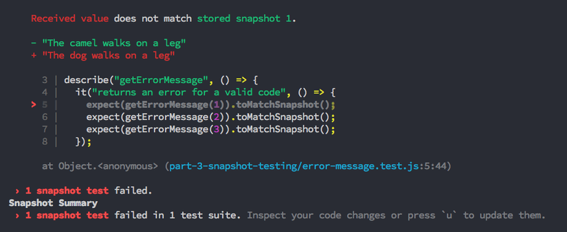 Đối với trường hợp thứ 2, sự thay đổi này bạn cần 'chụp' snapshot lại Hình ảnh trên bạn có thể thấy Jest yêu cầu nhấn chữ 'u' để chụp snapshot lại nếu đó thực sự là thay đổi chủ quan của bạn.