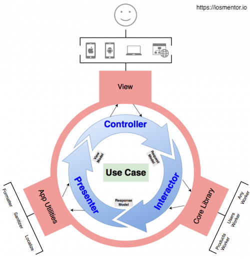 Phần cốt lõi của kiến trúc là Controller, Interactor, và Presenter. Một điều quan trọng cần lưu ý đây là kiến trúc unidirectional Data Flow tức là dữ liệu sẽ di chuyển theo 1 luồng xác định, điều này làm giảm đáng kể sự phức tạp, dễ dàng để quản lý.