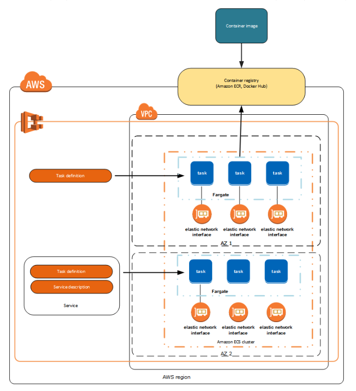 Amazon ECS là một dịch vụ theo region, nó đơn giản hoá việc chạy ứng dụng containers trên nhiều AZ trong cùng một Region. Bạn có thể tạo một ECS cluster bên trong một VPC mới hoặc cũ. Sau khi một cluster được khởi tạo và chạy, bạn có thể định nghĩa cá task và services mà nó chỉ định Docker contatainer image sẽ chạy thông qua clusters.