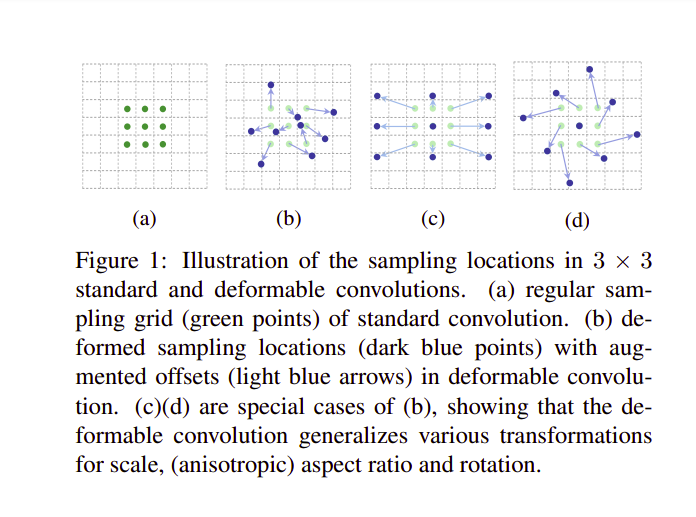 Deformable Convolution xuất phát ý tưởng cộng thêm vào các vị trí lấy mẫu trong các lớp convolution truyền thống một mảng offsets 2 chiều. Điều này cho phép lớp tích chập lấy mẫu tại những vị trí đa dạng hơn. Đặc biệt các giá trị offsets này điều được học từ các bản đồ đặc trưng trước đó thông qua các lớp tích chập nhờ vậy các giá trị offsets linh hoạt thích ứng với dữ liệu đầu vào