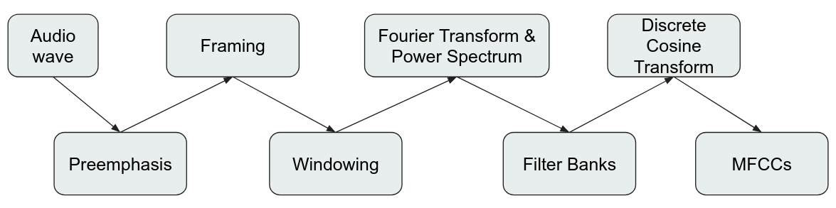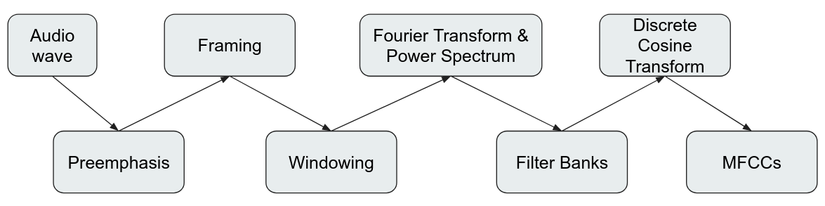 Với nguyên lý hoạt động ở trên, để hiện thực cho máy tính trích xuất được MFCCs thì ta sẽ phải thêm một số thành phần khác. Pipeline cơ bản như sau: