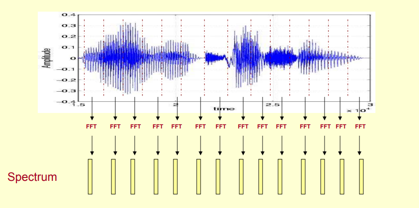 Đầu tiên, ta sẽ biến đối speech signal thành âm phổ (hay còn gọi là spectrum) bằng cách áp dụng Fast Fourier Transform, mình sẽ không giải thích giải thuật này, các bạn có thể xem khái niệm ở wikipedia.