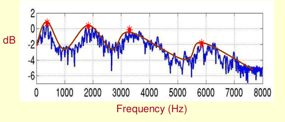 Ở hình trên, các điểm màu đỏ được gọi là Formants, là nơi có các tần số áp đảo (dominant), mang đặc tính của âm thanh. Đường màu đỏ gọi là Spectral Envelopes. Mục tiêu chính của ta là lấy được đường màu đỏ này.