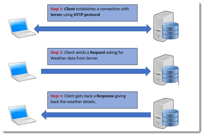 Client và Server được kết nối với nhau bằng giao thức HTTP. Khi kết nối được thiết lập, Client sẽ gửi yêu cầu tới Server dưới dạng XML hoặc Json mà cả hai đều có thể hiểu được. Sau khi hiểu yêu cầu, Server sẽ trả về một response (phản hồi) để trả về dữ liệu mà Client yêu cầu dưới dạng XML hoặc Json.