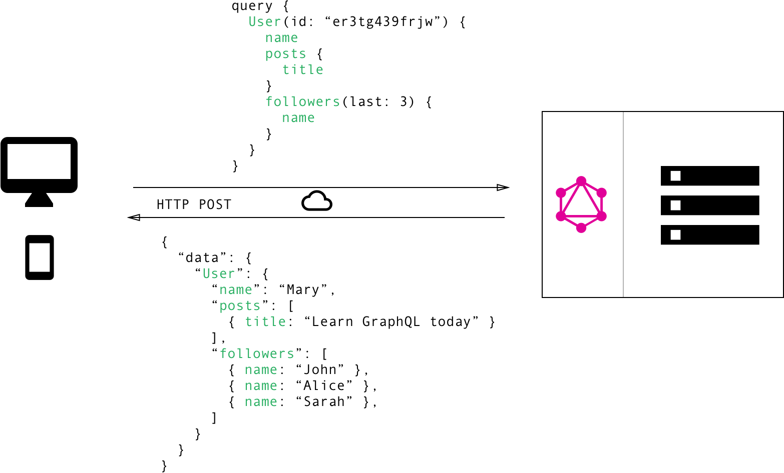 - Với GraphQL, bạn chỉ cần đơn giản gửi một câu query tới GraphQL Server bao gồm các yêu cầu dữ liệu cụ thể. Server sẽ trả về một JSON object đáp ứng các yêu cầu client gửi lên. Chú ý rằng Cấu trúc response mà Server trả về sẽ tuân theo chính xác cấu trúc lồng nhau mà được chỉ định trong query gửi lên từ Client.