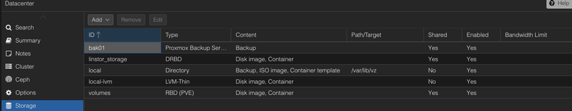 Cuối cùng, chúng ta tích hợp tất cả các cluster Storage lên Proxmox ở đây Pool Volumes (RBD) tương ứng cho hệ thống Ceph và linstor_storage (DRBD) tương ứng cho LINSTOR cluster đã triển khai ở trên. Mọi thứ đã sẵn sàng cho việc đánh giá hiệu năng