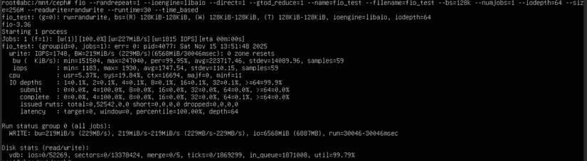 Ceph cho kết quả BW=229MB/s IOPS=1748