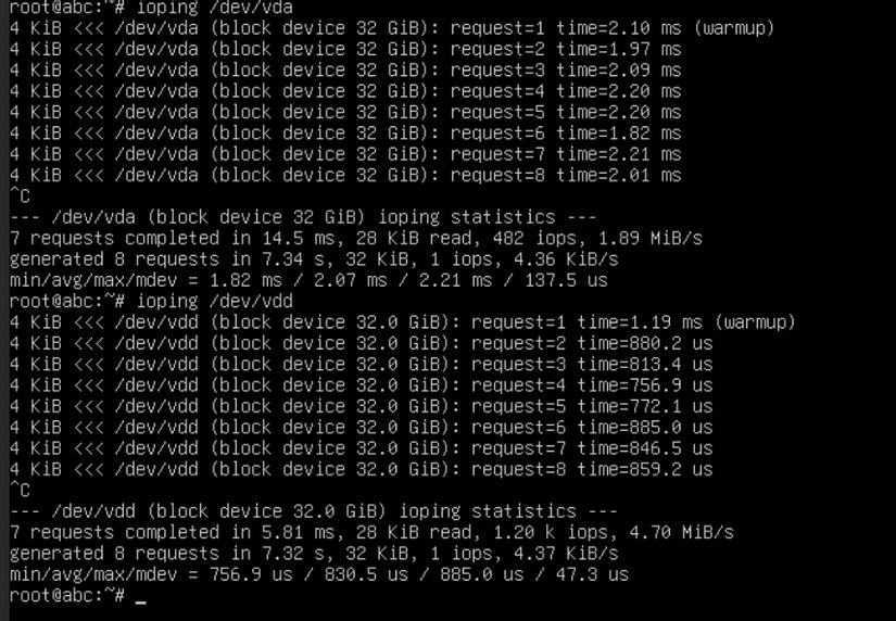 Kết quả cho thấy ceph vda có latency ~2ms còn LINSTOR vdd ~800us gần như bằng 1/2 của Ceph. Bài test này LINSTOR win (1-0).