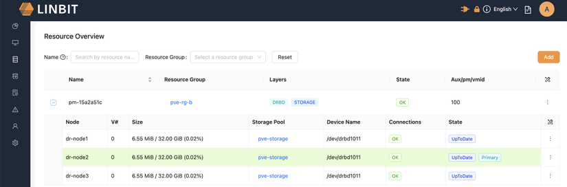 Hệ thống LINSTOR cũng được triển khai ngay trên 3 node Proxmox VE trên, cấu hình Pool Resource tương ứng replicate 3.