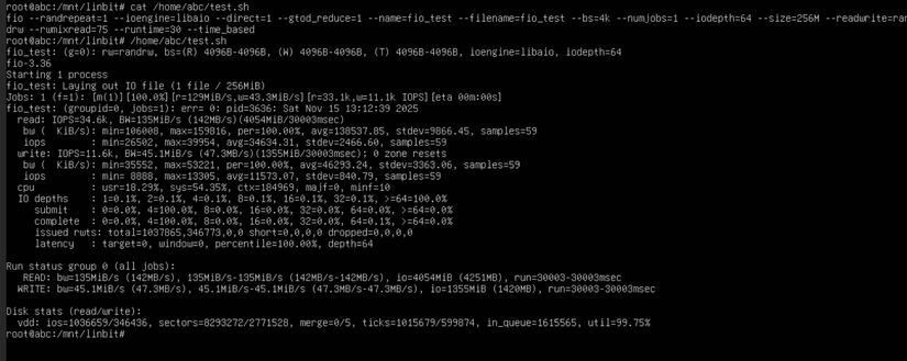 Cùng một VM đó kết quả với LINSTOR khá bất ngờ tổng IOPs 44k trong đó Read 35k và Write 11k