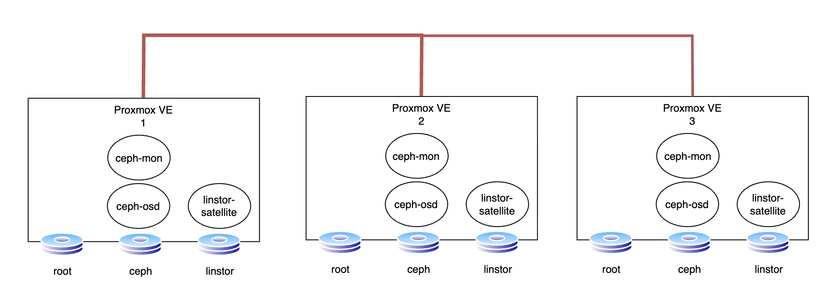 Với cùng 3 node Promox VE, triển khai cả Ceph và LINSTOR trên cả 3 node tương đồng từ đó có thể đánh giá hiệu năng một cách rõ nét nhất.