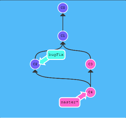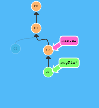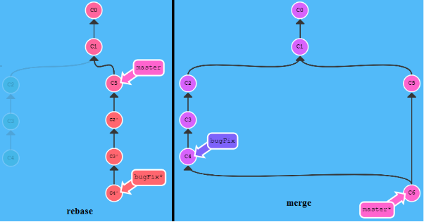 Thao tác này sẽ đưa toàn bộ những commit mới tạo ở nhánh bugFix nối tiếp vào "ngọn" của nhánh master, nó sẽ viết lại lịch sử của project bằng cách tạo ra những commit mới ứng với mỗi commit ban đầu của nhánh bugFix