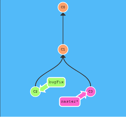 Ta có 1 nhánh chính master và nhánh con bugFix. Hiện tại, ta đang đứng ở branch master. Sản phẩm tiếp tục được phát triển, thành viên khác làm việc ở nhánh bugFix đã cập nhật thêm những commit mới. Để chuẩn bị cho buổi demo sản phẩm, ta phải tích hợp những commit ở nhánh bugFix vào nhánh master. Git đưa ra 2 cách giải quyết vấn đề: Merge hoặc Rebase.