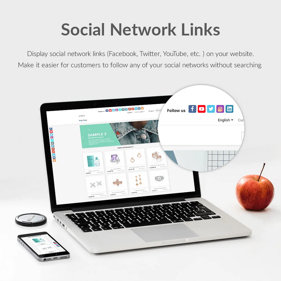 - Vous permet de choisir n'importe quel réseau social à afficher sur le site Web de votre magasin parmi les 12 fournis et d'y ajouter facilement des liens.