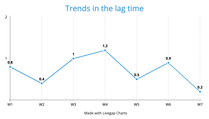 Ngoài những metric trên đây, bạn có thể đo tất cả những gì bạn muốn. Ví dụ, để giải quyết được bài toán phải làm sao khi dev liên tục trễ bản build hay khách hàng trả lời trễ Q&A ư? Chúng ta sẽ chửi mắng dev hay KH để giải quyết ?😎 (Gud idea). Chúng ta sẽ có metric cho việc đo lag time. Và dưới đây là biểu đồ lag time ( thời gian chết) của team testing. Sau khi có biểu đồ này rồi thì cứ cuộc họp lôi nó ra làm bằng chứng mà chửi thui 😏