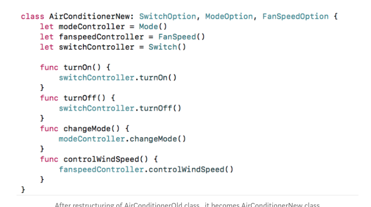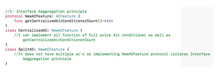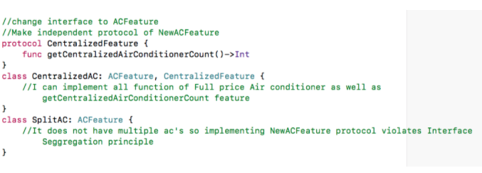 Như vậy việc tách method getCentralizedAirConditioner() ra khỏi protocol ACFeature đã giúp cho class SplitAC không bị phụ thuộc vào method này.
