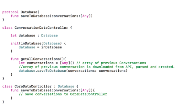 Như vậy, thay vì chứa một thực thể CoreDataController thì class ConverstionData chỉ chứa 1 thực thể trừu tượng DataBase. Do đó sự phụ thuộc của 2 module sẽ giảm đi đáng kể. Trong trường hợp muốn thay module CoreDataController ta chỉ việc tạo một module mới và conform protocol Database