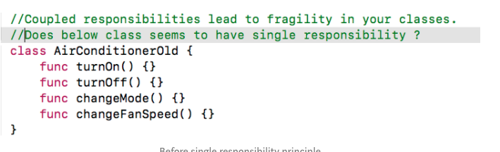 Trong ví dụ trên class AirConditioner có 4 chức năng, bật, tắt, chuyển chế độ, chỉnh tốc độ. Trong thực tế một class như vậy sẽ chứa rất nhiều chức năng. Điều này làm cho class ngày càng phình to và khó quản lí. Vì vậy, nguyên tắc này ra đời nhằm mục đích giải quyết vấn đề trên.