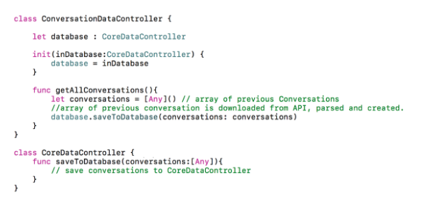 Trong ví dụ trên, class CoversationData là module bậc cao, CoreDataController là module bậc thấp. Ta thấy class ConverstionData đang chưa một thực thể CoreDataController. Có thể thấy module bậc cao đã bị phụ thuộc vào module bậc thấp vì vậy sẽ gây khó khăn nếu muốn thay module CoreDataController bằng module khác. Để giải quyết ta tạo thêm một class để trừu tượng để giảm sự phụ thuộc của 2 bên.