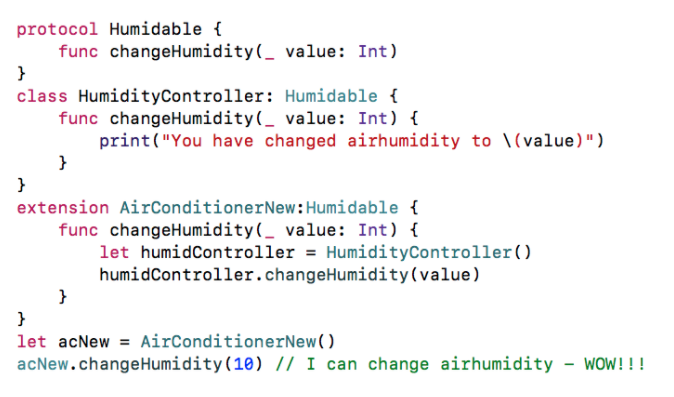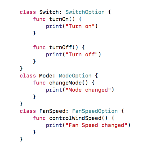 Ta thấy 2 class CentralizedAC và SplitAC đều conform protocol ACFeature, tuy nhiên class SplitAC lại không sử dụng method getCentralizedAirConditioner(). Để giải quyết vấn để này ta phải tách method getCentralized ra khỏi protocol NewFeature như sau.