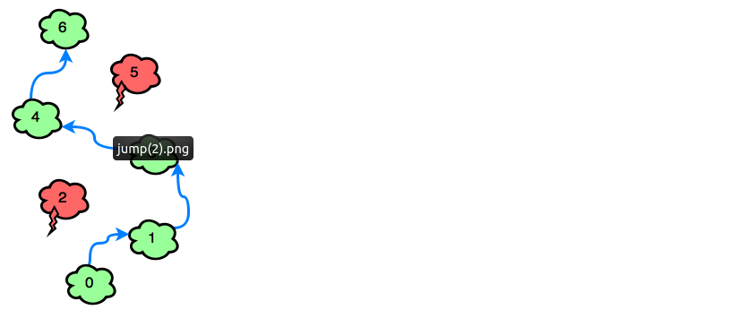 .Emma đang chơi một tựa game di động mới có tên là nhảy qua những đám mây . Trong số những đám mây ta có hai loại đó chính là mây sấm và mây bình thường . Emma có thể nhảy lên bất cứ loại mây bình thường nào , nhưng không được động đến những mấy sấm.Mỗi lần nhảy Emma chỉ có thể nhay 1 hoặc 2 ô , không được nhảy xa hơn.Vậy bạn hãy viết một hàm , giúp Emma nhảy từ vị trí bắt đầu đến đám mây cuối cùng bằng số lần nhảy nhỏ nhất.