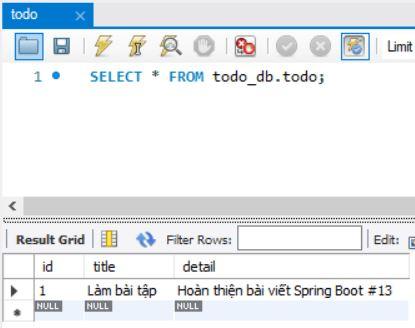 INSERT INTO `todo_db`.`todo` (`title`, `detail`) VALUES ('Làm bài tập', 'Hoàn thiện bài viết Spring Boot #13');