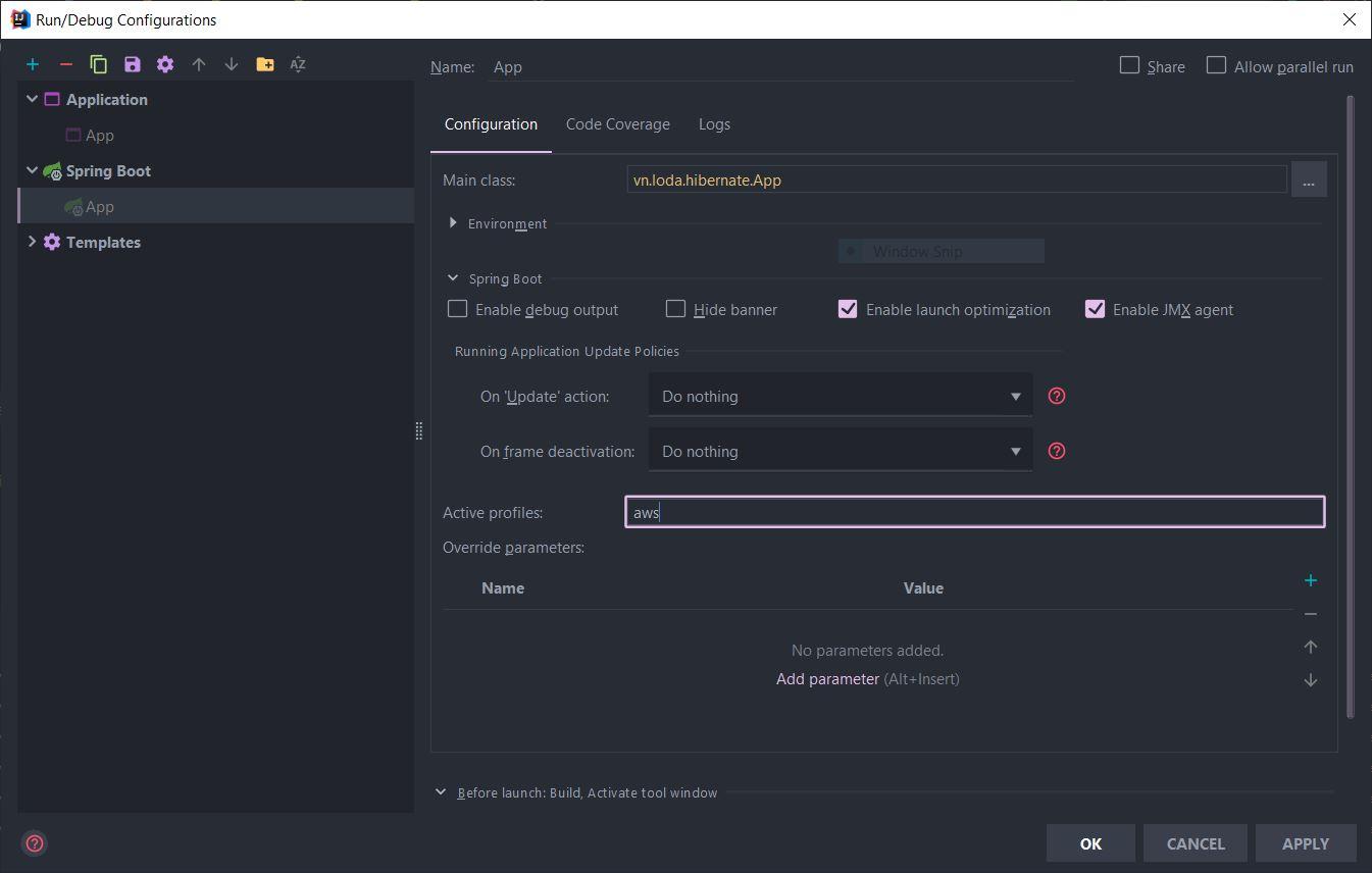 Tadaa, xong, mình giải thích chút. bạn để ý trong file application.yml mình có khai báo 2 môi trường là local và aws. Tại mỗi môi trường sẽ include (bao gồm) các file config như kia. Khi mình kích hoạt aws chẳng hạn, Spring sẽ load tất cả config có trong application-common.yml và application-aws.yml. Rất tiện phải không :3