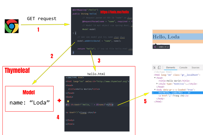 Chúng ta viết thẻ H1 như bình thường, nhưng không chứa bất cứ text nào trong thẻ. Mà sử dụng cú pháp th:text="${name}" để Thymeleaf lấy thông tin từ biến name và đưa vào thẻ H1.