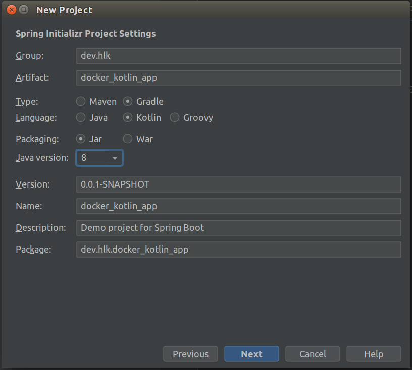 - Điền các thông tin về Spring Artifcat, Gradle, Kotlin, Java: 8