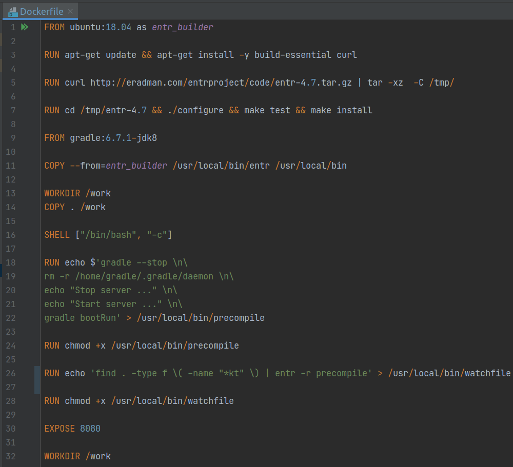 RUN echo 'find . -type f \( -name "*kt" \) | entr -r precompile' > /usr/local/bin/watchfileđóng vài trò lắng nghe sự kiện thay đổi file và gọi lại đếnprecompiletrên.