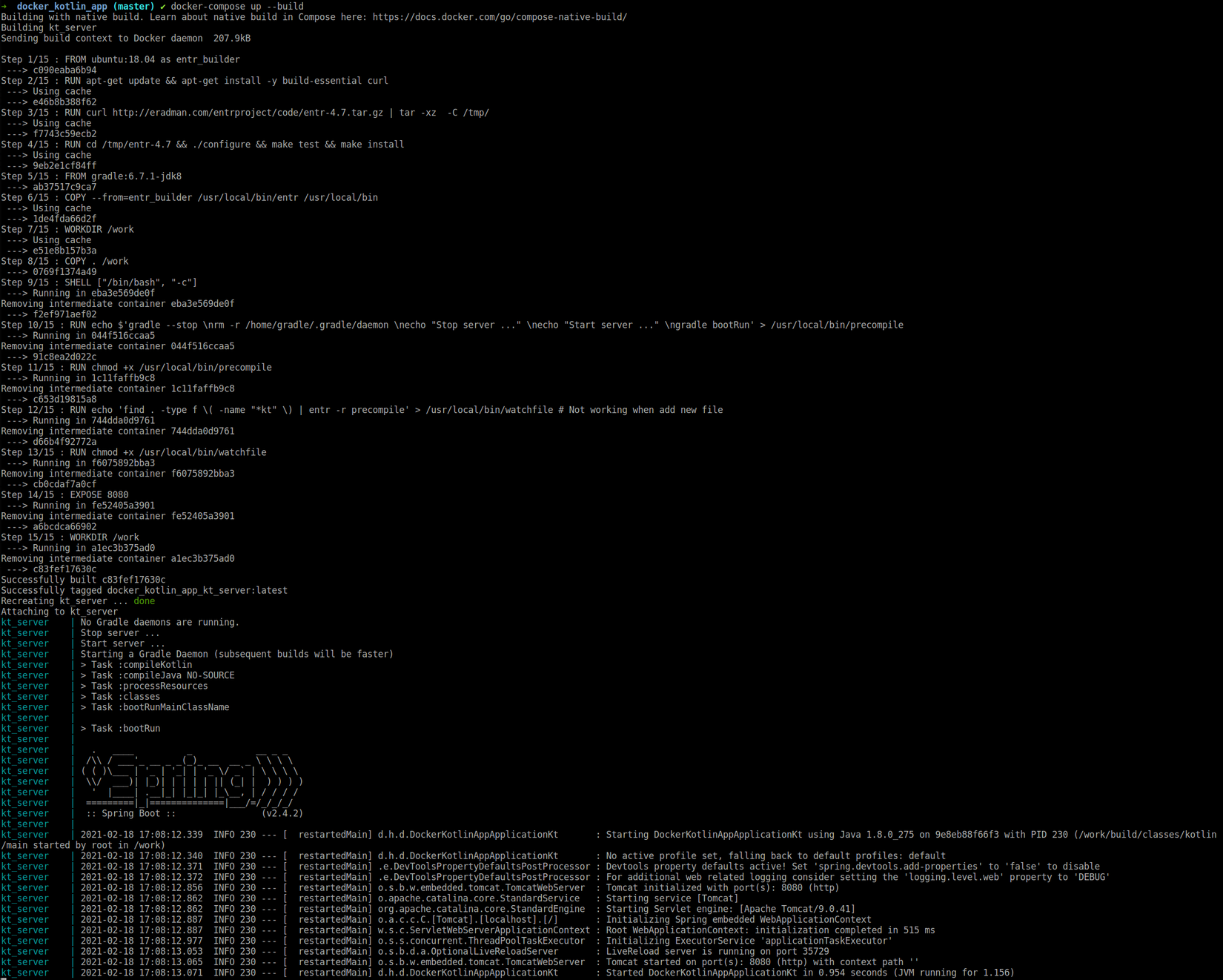 Trong khi phát triển một ứng dụng Spring boot sử dụng ngôn ngữ Kotlin với docker phải thông qua quá trình build mới có thể start được server cho nên khi phát triển sẽ sửa code liên tục cần nó tự động nhận code mới. Vậy trong bài viết này sẽ giới thiệu qua về giải pháp tận dụng một công cụ entr để lắng nghe khi file thay đổi sẽ trigger rebuild và start lại server. Để mô phỏng thực tế sẽ build một ứng dụng RESTful sử dụng Spring boot, Kotlin với Gradle là quan lý dependencies trong môi trường của Docker.