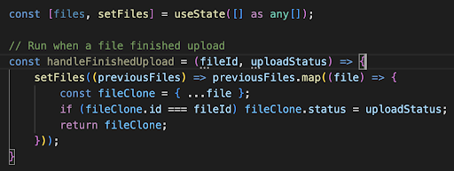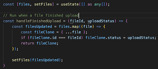 Thật sự tôi đã rất bối rối khi debug đoạn này, theo như tôi hiểu, vấn đề là do files state của tôi đang nhận giá trị cũ. Tại thời điểm file 1 finished thì file 2 và file 3 vẫn uploading, nhìn như không thấy vấn đề gì, nhưng sau đó khi file 2 finished thì tại scope này, files state bên trong hàm handleFinishedUpload vẫn chứa giá trị bao gồm file 1 và file 3 uploading, dù cho trước đó đã update files state với file 1 có status là uploaded.