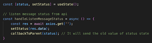 Lúc này, ngay sau khi gọi hàm setStatus, chúng ta đều mong muốn rằng state status sẽ được update ngay lập tức. Nhưng không, việc set giá trị mới cho state status sẽ được đưa vào event loop và xử lý sau.