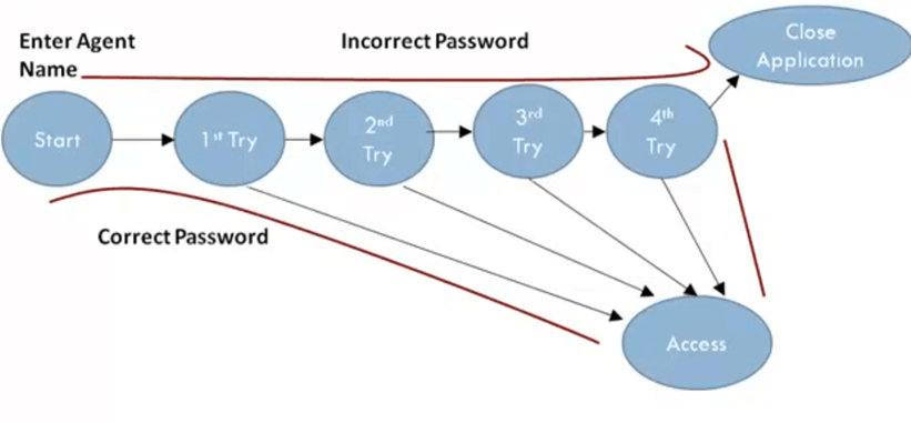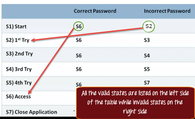 Ví dụ, trong khi ở trạng thái S1, bạn nhập mật khẩu chính xác, bạn sẽ được đưa đến trạng thái S6 (Đã cấp quyền truy cập). Giả sử nếu bạn nhập sai mật khẩu ở lần thử đầu tiên, bạn sẽ được đưa đến trạng thái S3 hoặc Thử lần 2.