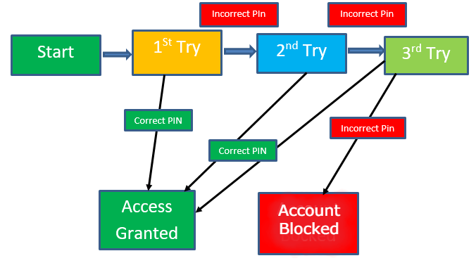 Trong sơ đồ, bất cứ khi nào người dùng nhập mã PIN chính xác, sẽ được chuyển sang trạng thái được cấp quyền truy cập và nếu nhập sai mật khẩu, sẽ được chuyển sang lần thử tiếp theo và nếu làm như vậy trong lần thứ 3 thì tài khoản sẽ đạt đến trạng thái bị khóa.