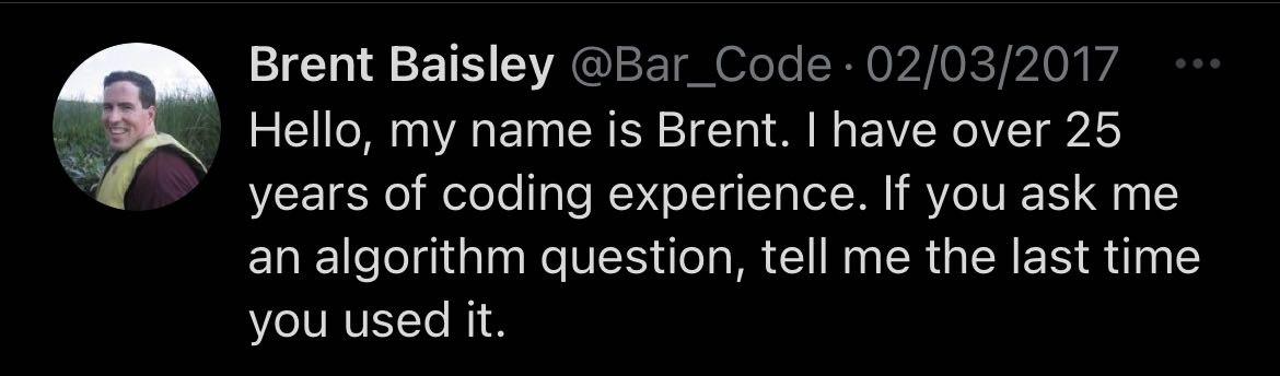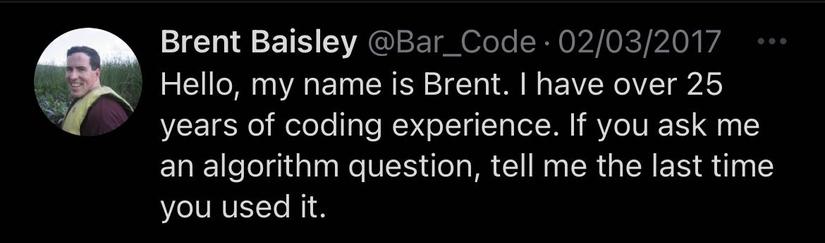 "Tôi có 25 năm kinh nghiệm lập trình. Nếu bạn hỏi tôi một câu hỏi về thuật toán, nói cho tôi biết lần cuối bạn dùng thuật toán đó là khi nào"