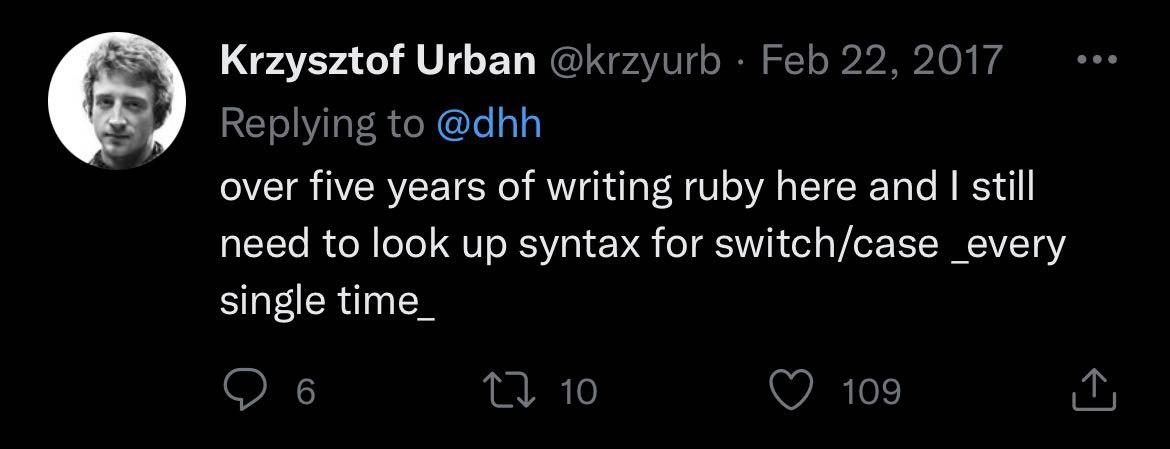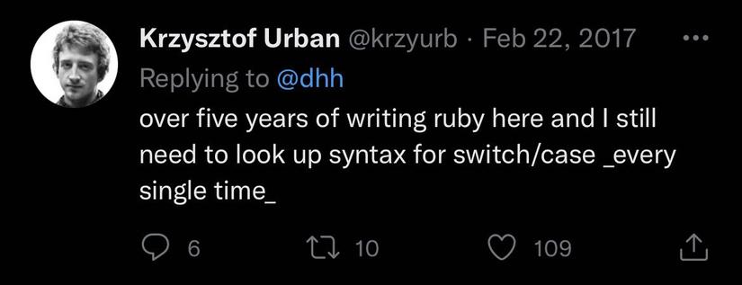 "5 năm làm Ruby mà mỗi lần cần dùng vẫn google cú pháp câu lệnh switch case"